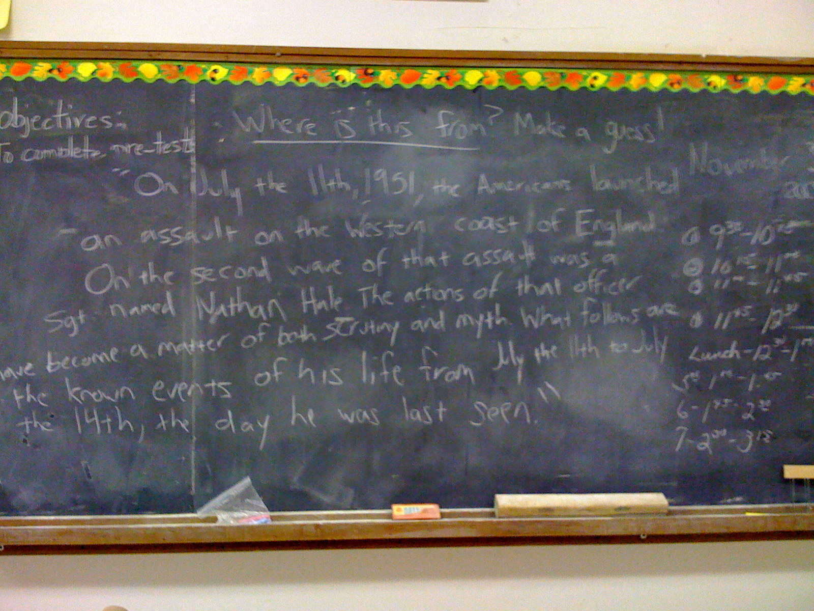 I was pretty certain the students would not be able to identify where the quote came from, but I wasn’t expecting them to. The method behind my madness was I wanted the students to tell me the quote was a fake, and could not possibly have happened. Instead for the whole day the students were telling me that the quote had to come from a historical documentary. They recognized the name Nathan Hale as the namesake of another high school in the district, but they had no idea that the Nathan Hale the school was named after has been dead for about two-hundred years.