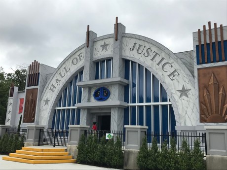 Justice League: Battle for Metropolis is an interactive 3D dark ride found in Six Flags parks. We rode on the one currently at Six Flags: Great Adventure in Jackson, NJ. It is in the DC-themed area of the park near Batman: The Ride, The Dark Knight Coaster, and the upcoming ride Cyborg: Cyber Spin. Honestly, it’s in a perfect place. The area is made up to look exactly like it had in the Superfriends cartoon series, with the same fountain right out front.