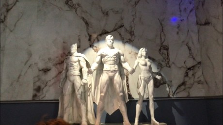 The ride’s theming was incredible for a Six Flags ride. The ride building looked exactly like the Hall of Justice first featured in the SuperFriends cartoon, a replica of Cincinatti’s Union Terminal. Inside the building held a queue line where banners hung from the walls, and the words written on each of the banners held an ideal by one of the Justice League’s members. At the end of the main entrance hall was a marble statue of three of the League’s founding members, Batman, Superman and Wonder Woman.
